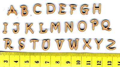 Lettres en mdf naturel collection "Mini Arkos", +/- 1 cm, création AL63. Alphabet complet, 26 lettres.