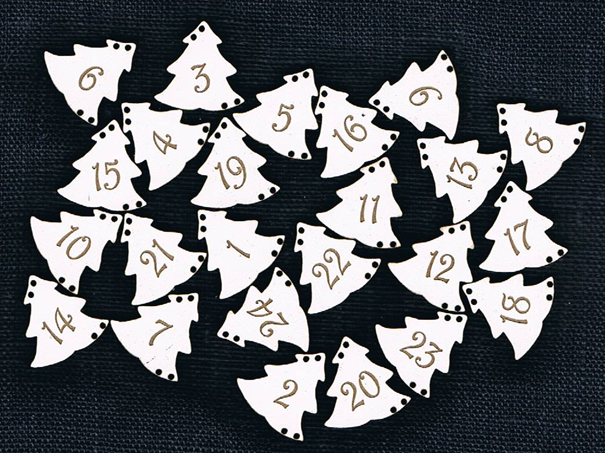 Lot de 24 boutons numérotés, forme de sapin, +/- 2 cm, en mdf laqué blanc. Création AL63