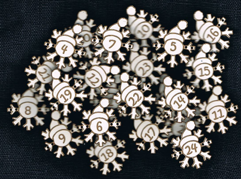 Lot de 24 boutons numérotés, forme de flocon de neige, +/- 3 cm, en mdf laqué blanc. Création AL63