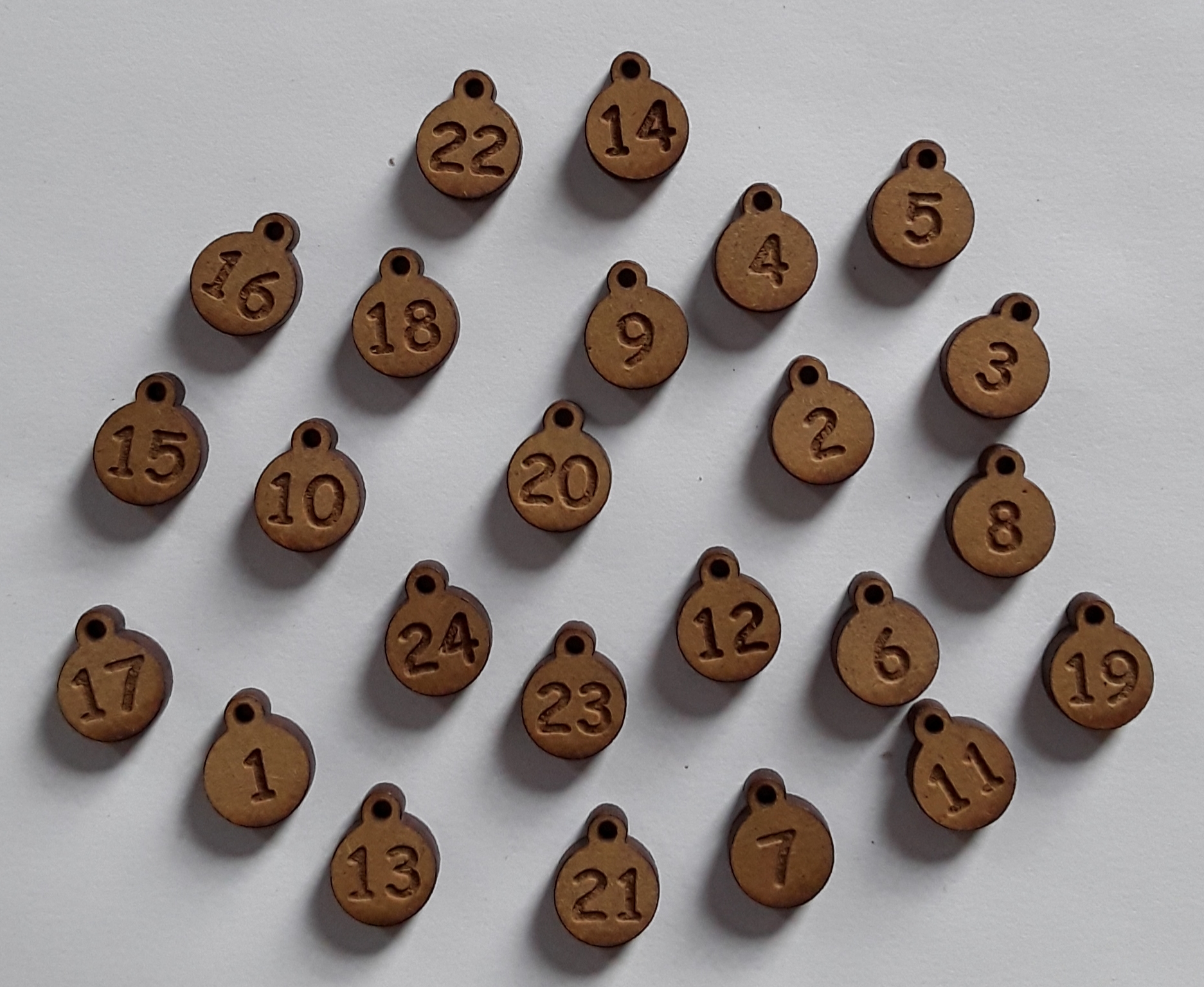 Lot de 24 boutons numérotés, forme de boule , +/- 1 cm, en mdf nature. Création AL63