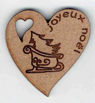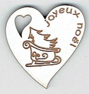 Étiquette cœur, sapin et traineau, +/- 3.6 x 3.9 cm, naturel ou laqué blanc, création al63