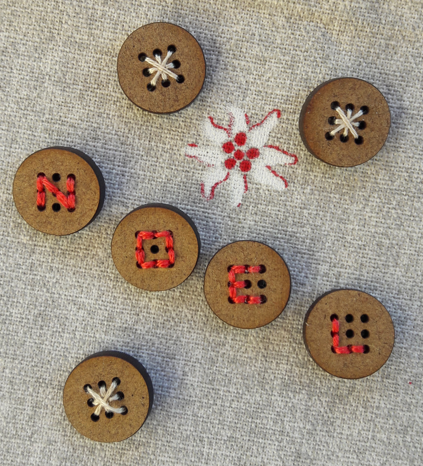 Lot de 5 mini bouton à broder, Carré, Rond, Coeur, Fleur, Hexagone +/- 15 x 15 mm, mdf nature