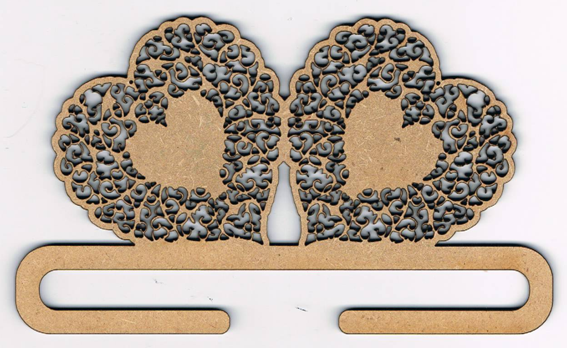 Support cintre au motif "duo de coeur en dentelle", 15 x 9 cm, pour des bandes de 13.5 cm maxi, naturel peut être peint, vernis. Création AL63