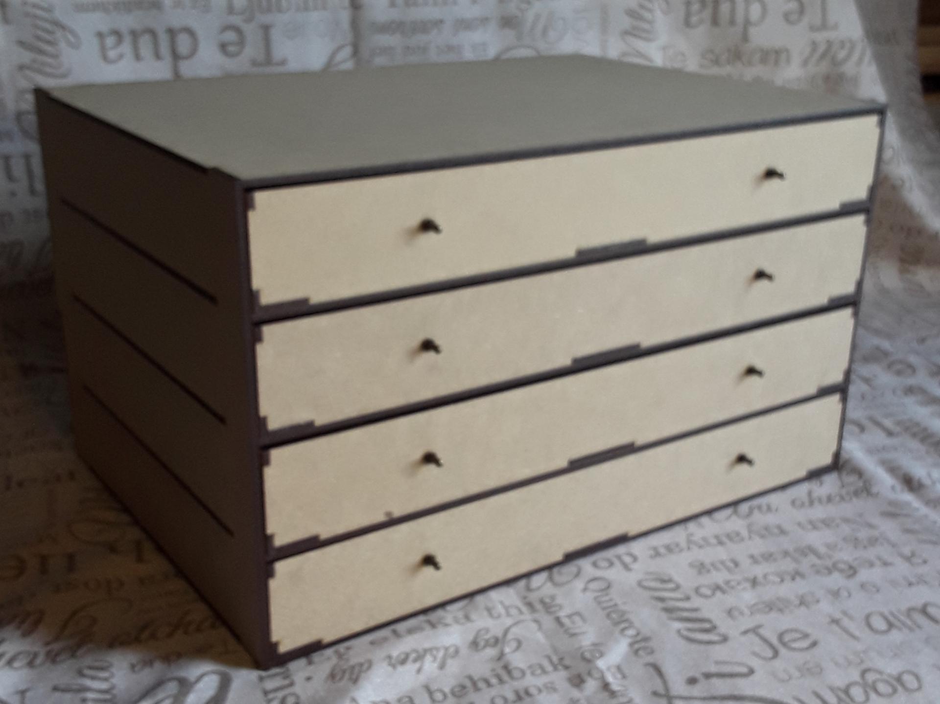 Casier bas, 4 tiroirs avec 8 séparations (peut contenir +/- 700 cartonettes) taille 35,5 x 25 cm, hauteur 20,5 cm