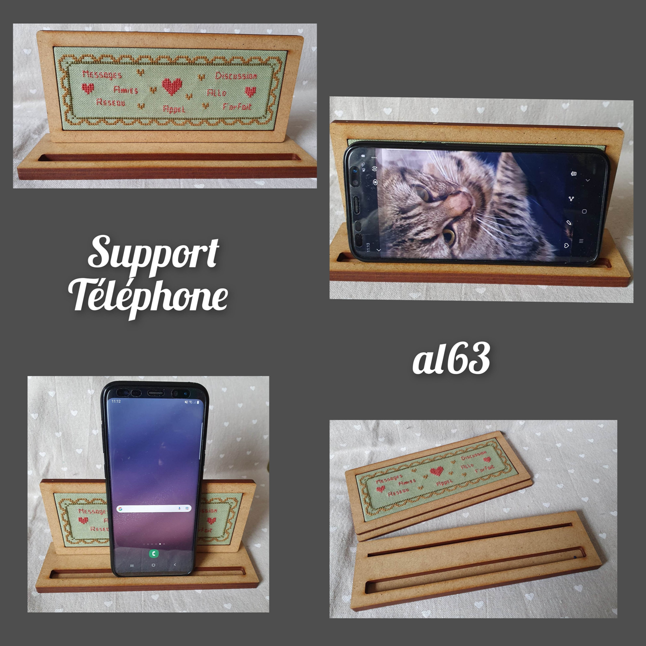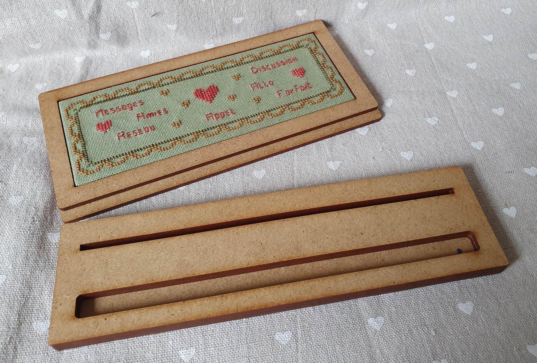 Support téléphone avec cadre et interieur plein pour y mettre votre ouvrage, base 19,5 x 5,5 cm, dos 18 x 8,5 cm, interieur cadre 16 x 5,5 cm (livré sans broderie ni fiche)