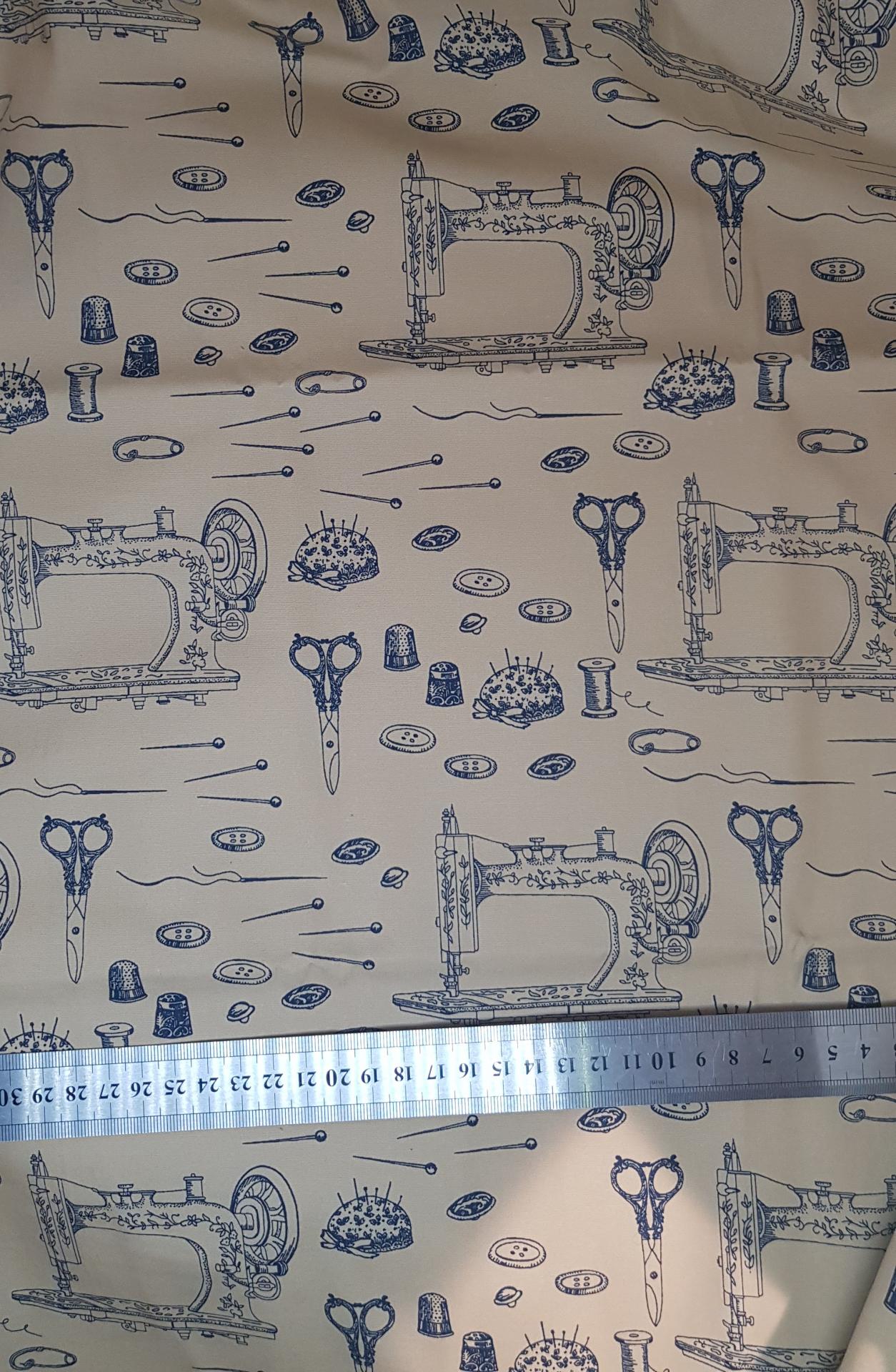 Tissus coton imprimé machine à coudre fond beige, 1 m x 1,10 mètre